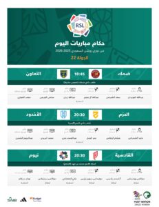 أعلنت لجنة الحكام بالاتحاد السعودي لكرة القدم عن طواقم تحكيم مباريات اليوم الخميس، ضمن منافسات الجولة الـ22 من دوري روشن السعودي للموسم 2025-2026.