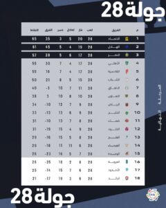 ويكون ترتيب الدوري السعودي بعد 28 جولة على النحو التالي:-