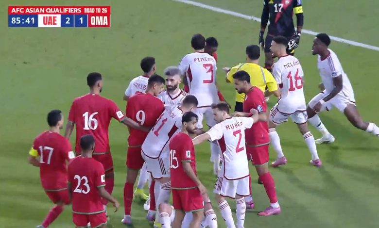 مشادة بين اللاعبين في مباراة الامارات وعمان بتصفيات كأس العالم